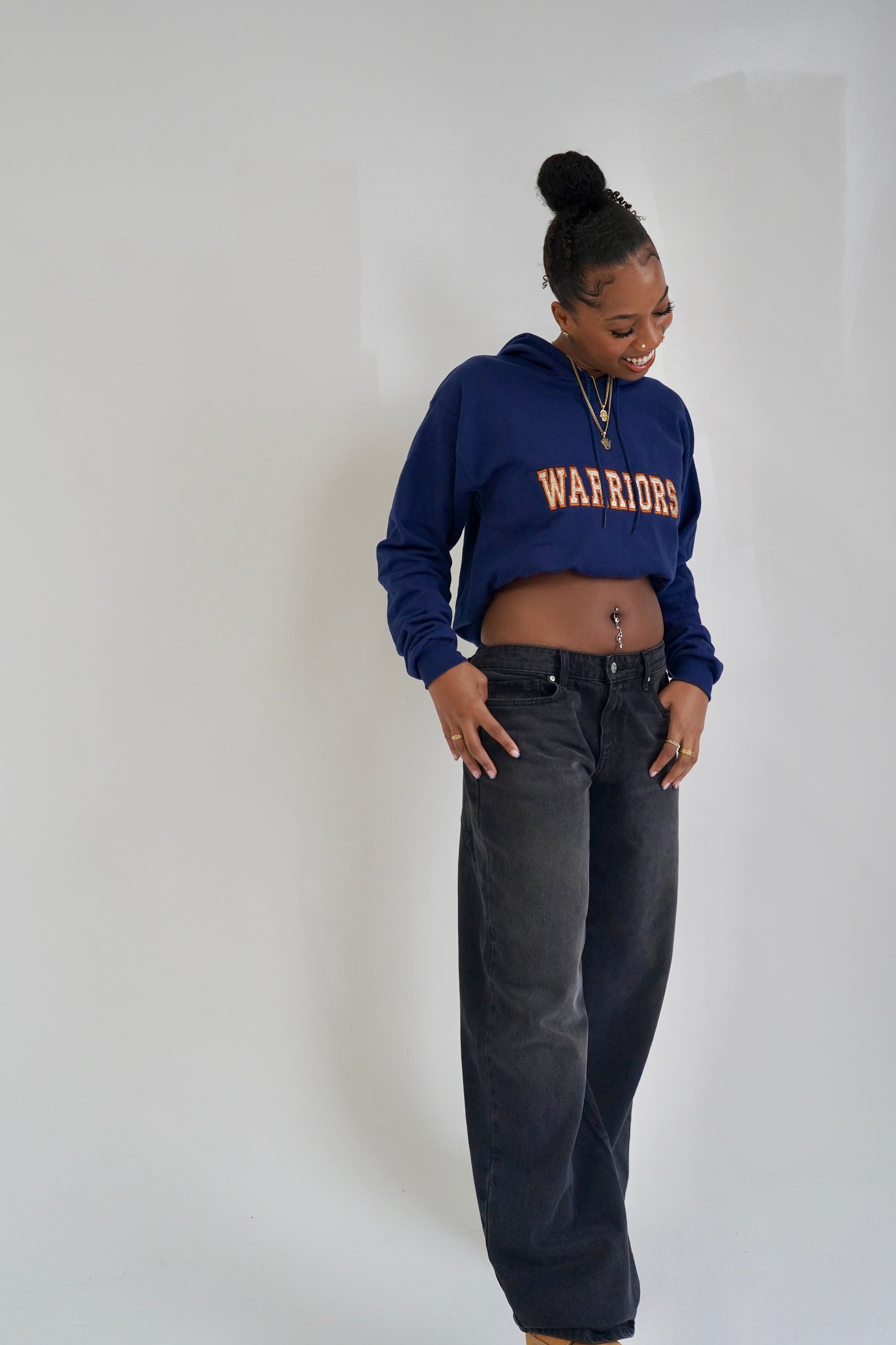 Navy Blue Embroidered warriors hoodie. Vintage design, glitter applique, classic warriors colors.